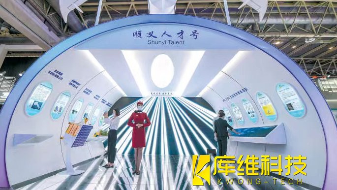 在順義展區,模擬機艙的展臺“順義人才號”也頗為吸引眼球。走進展臺,就像走入機艙,兩側是優秀項目介紹,前方大屏幕上的聲光電影講述著順義高端制造業的故事,代入感十足。