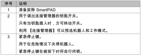如果工業機器人 smartPAD 已拔出,則無法再通過 smartPAD 上的緊急停止按鍵來使設備停機。 因此必須在機器人控制系統上外接一個緊急停止裝置。運營商應負責將已拔出的 smartPAD 立即從設備中撤離并將其妥善保管。保管處應遠離在工業機器人處作業的工作人員的目視和作用范圍。 其中目的是為了防止有效的和無效的緊急停止裝置被混淆。如果沒有注意該措施, 則有可能造成人員嚴重身體傷害乃至致命或者巨大的財產損失。