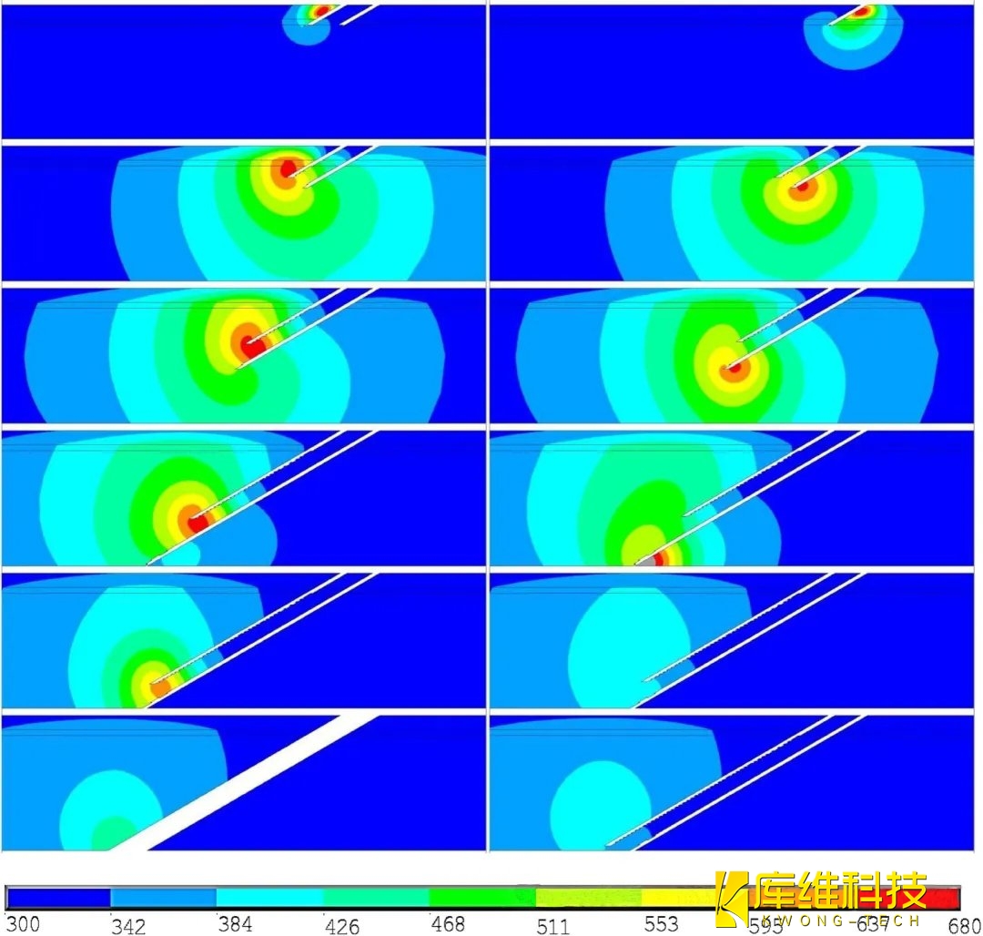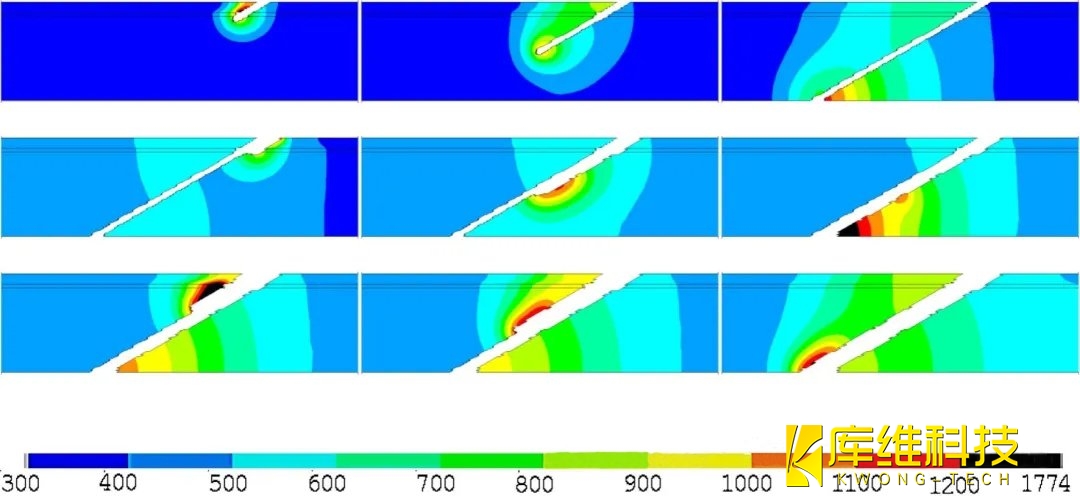 2、水導(dǎo)激光打孔角孔時,孔前緣僅在打孔開始時經(jīng)歷高溫。隨著鉆孔向下移動(以螺旋方式),高溫區(qū)域已完全包含在激光照射區(qū)域內(nèi),從而實現(xiàn)無分層鉆孔。這與毫秒激光鉆孔相反,在毫秒激光鉆孔中,從鉆孔過程開始到結(jié)束,在孔的前緣可以觀察到有明顯更高的溫度。