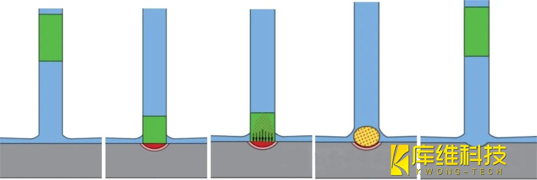 圖8給出了水導(dǎo)激光加工過程的合理機理。首先,通過水引導(dǎo)(圖8b)的激光脈沖(圖8a)與材料表面相互作用。激光與材料的相互作用(圖8b)導(dǎo)致輻照區(qū)內(nèi)的加熱、熔化(圖8b)和輕微的汽化(圖8c)。由于脈沖長度較長(~ 150 - 250ns),部分激光束被汽化物質(zhì)吸收(圖8c),導(dǎo)致在激光照射區(qū)上方形成等離子體(圖8d)。在這個階段,等離子體充當水射流和材料之間的中間區(qū)域(圖8d)。這種現(xiàn)象與激光沖擊強化所觀察到的機制類似,在這種機制中,被困在水層和襯底之間的等離子體產(chǎn)生了高量級的壓力波。與最先進的納秒激光與材料的相互作用相比,等離子體產(chǎn)生的沖擊波以及高量級的蒸汽壓力加速了熔體噴射過程。一旦等離子體開始消失,水射流與高溫激光照射的表面相互作用,表面可能仍然有一層薄薄的殘余熔體。水射流與高溫激光照射區(qū)相互作用導(dǎo)致水的爆炸性汽化,產(chǎn)生脈沖沖擊壓力,導(dǎo)致激光照射區(qū)殘余熔體層被清除。因此,在水導(dǎo)激光鉆孔上沒有觀察到重鑄區(qū)或熱影響區(qū)。
