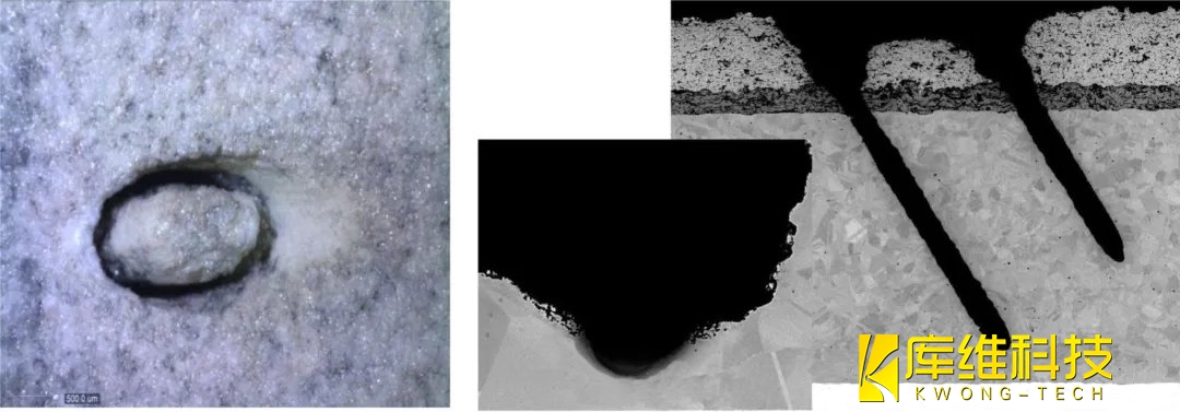 圖9、水導(dǎo)激光在與表面45°處部分鉆孔的光學(xué)顯微圖像