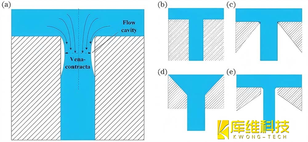 水射流的形成始于耦合腔噴嘴的特殊設計。如圖1所示,水流從上方流入收縮段(Vena contracti),經流腔(Flow cavity)加速后形成直徑約微米級的細射流。噴嘴形狀(如T形、圓形等)直接影響射流穩定性:
